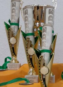 Im offiziellen Belohnungsteil erhielt jeder Anwesende seine Medaille und personaliserte Urkunde fürs Dabeisein in der Saison nach seinen individuellen Möglichkeiten. Die glücklichen Inhaber der ersten fünf Plätze durften zudem für ihre Erfolge auch gold-grün-strahlende Pöttchen in Empfang nehmen. Das Team Holger Appelt & Christian Funck wurde Sieger Tourensport. Über die Kreismeisterschaft 2025 und den Kopfweidepokal freute sich die Frau Holzdeppe 🙂